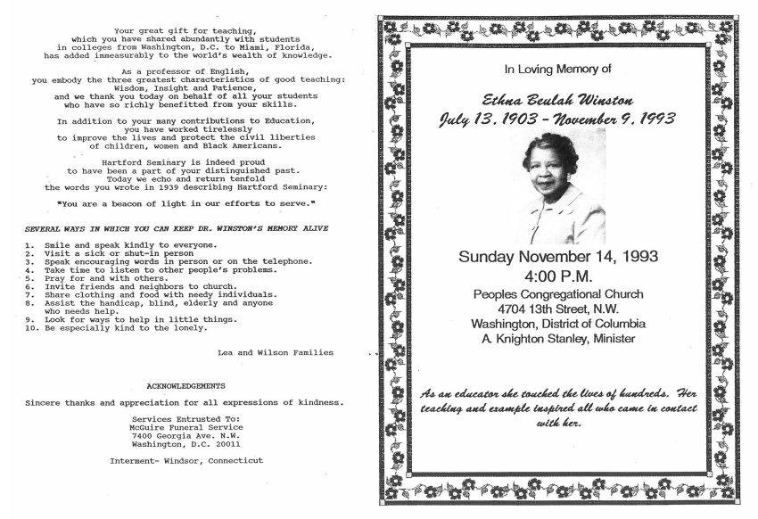 Dr. Winston’s memorial service program, 1993. | Courtesy of Marcia Hinckley.